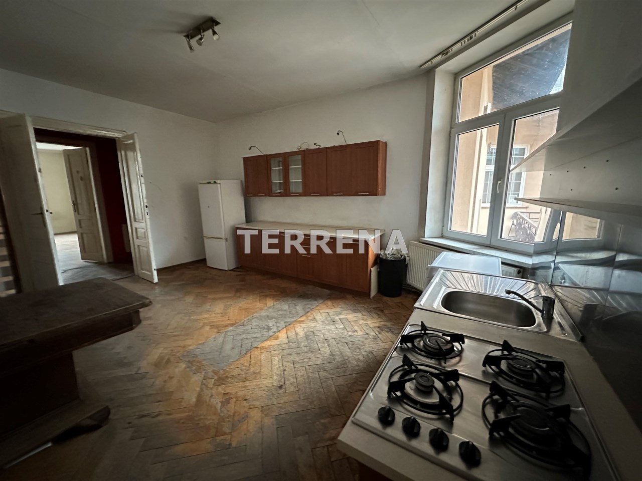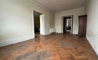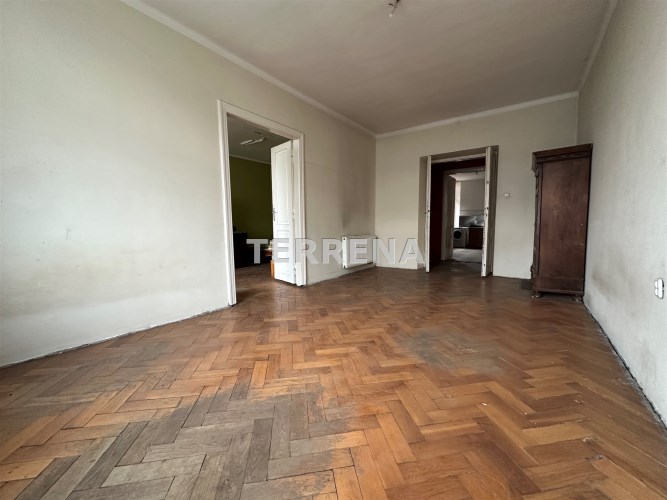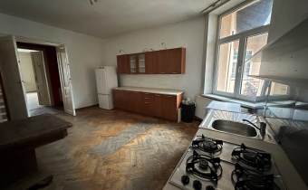 Lokal o łącznej powierzchni użytkowej 100,30 m2 składa się z 3 dużych pokoi o powierzchni (22; 21,7; 18,80 m2), dużej kuchni o pow. 21,60 m2, łazienki o pow. 5 m2, WC, spiżarki, p. pokoju o pow. 5,60 m2 oraz korytarza o pow. 3,10 m2. Mieszkanie wymaga remontu. Ogrzewanie oraz ciepła woda z pieca gazowego.